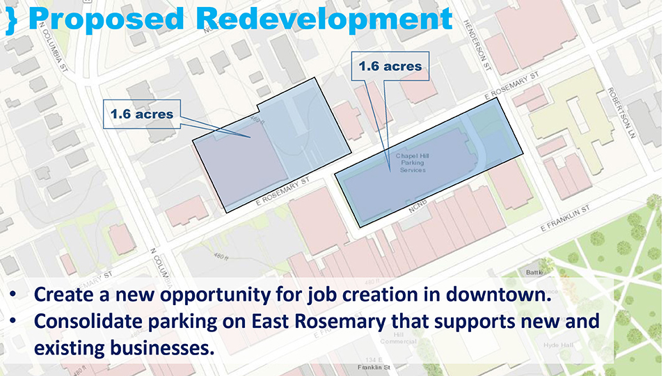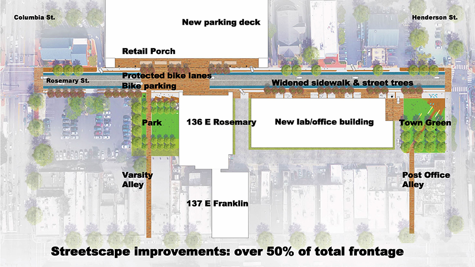 - Build a new parking deck on 137 East Rosemary parcel that provides approximately 300 net new public parking spaces (1,100 space deck)