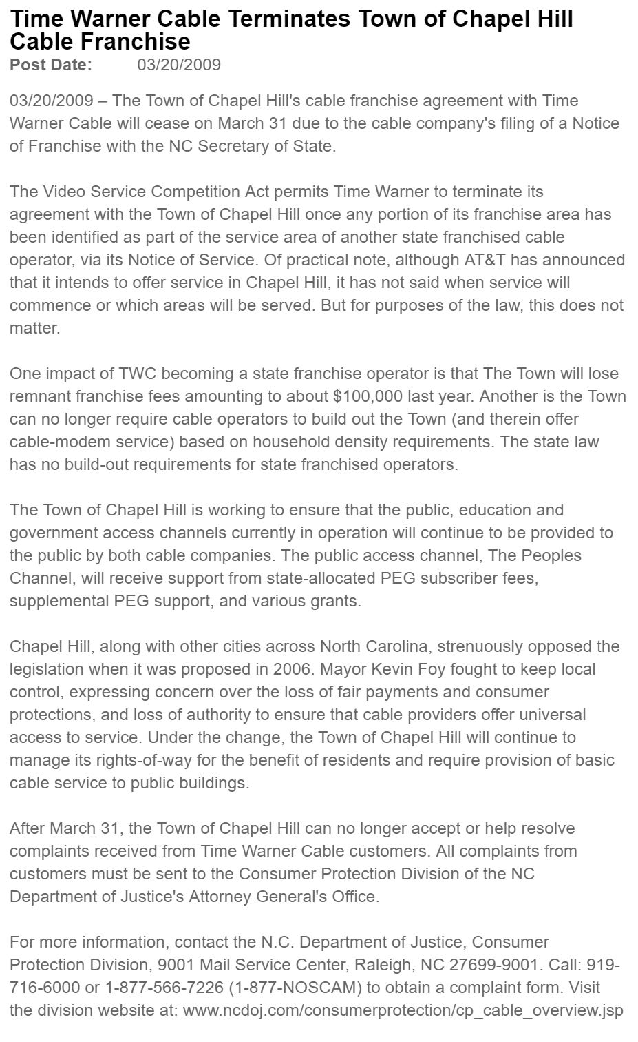 Cable questions or concerns may be directed to Consumer Protection Division of the NC Department of Justice's Attorney General's Office. See the News release about cable franchise termination.